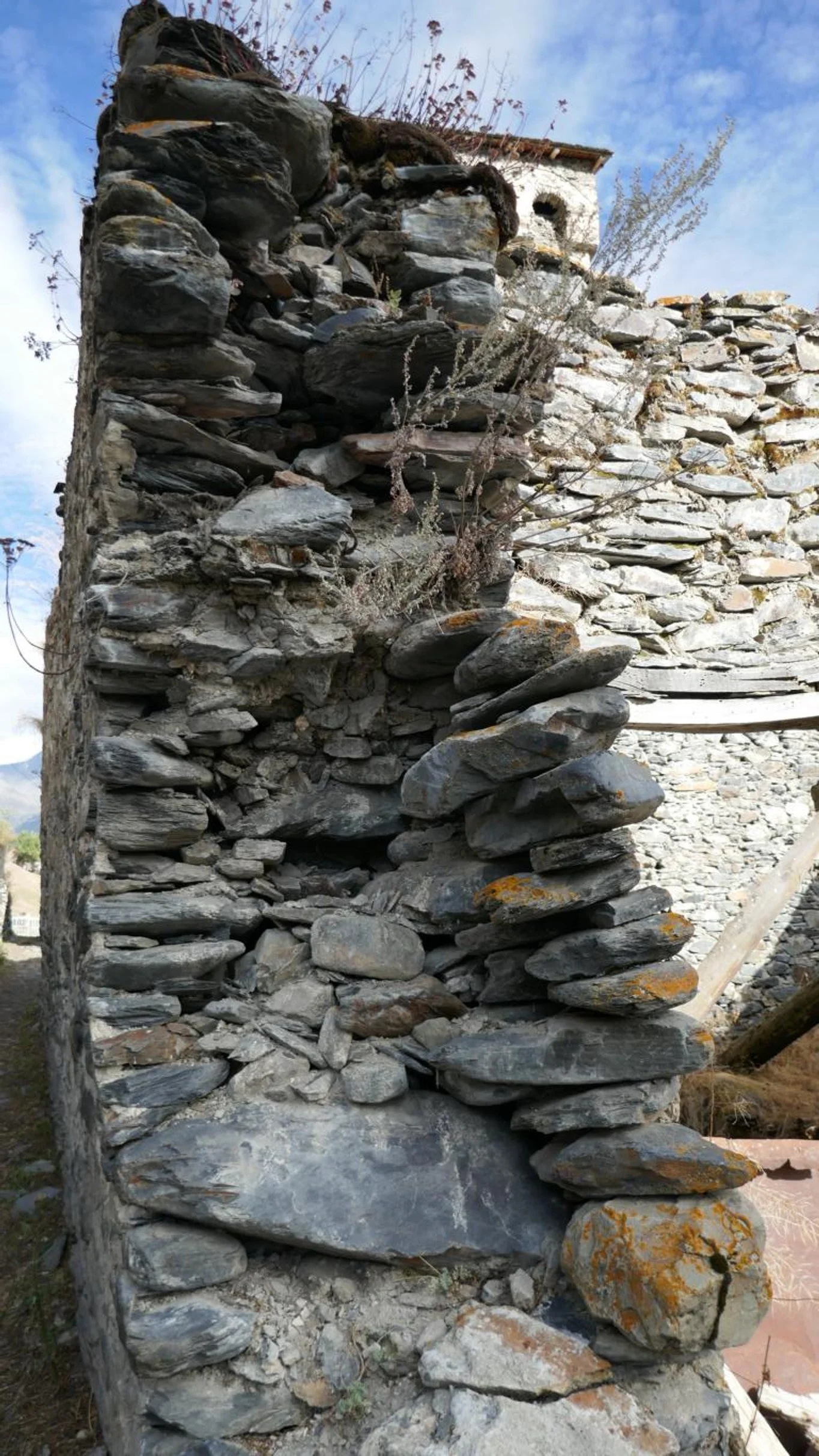 In case of an attack, the whole family fled from the second floor via a ladder into the defense tower (k'oshk'i). The up to 22 m / 72 foot tall towers were cone-shaped to improve the static and walls got thinner as they went up. Above a 6 m / 20 foot basement there were up to five floors which – for better defense – could only be reached via steep ladders and narrow holes. The top floor was designed in a way that occupants could shoot at attackers through embrasures or were able to throw rocks through special openings onto people standing right below.