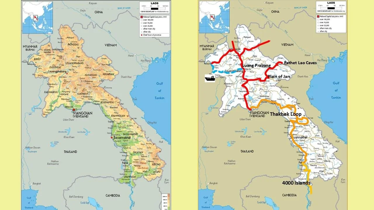 Die rote Linie in der zweiten Karte zeigt unsere Reise mit dem Auto durch Nord Laos im Oktober 2024 und die blaue strichlierte Kurve unsere Schifffahrt den Mekong hinauf. Die orange Linie zeichnet unsere Reise Route durch Süd Laos Ende November. Dazwischen reisten wir durch Vietnam.