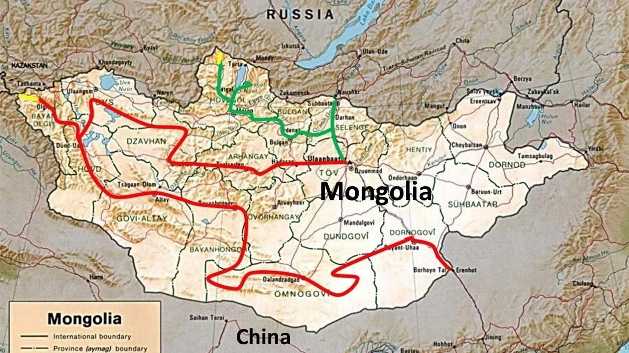 DEUTSCH: Anfang Juli reisten wir von Sibirien kommend in die Mongolei ein, wo wir zwei Monate verbrachten. Die ersten Wochen besuchten wir den Norden des Landes (siehe die grüne Route auf nachstehender Karte) und hatten die Gelegenheit an verschiedenen Orten am Naadam Fest teilzunehmen. Anschließend fuhren bzw. ritten wir ganz in den Norden und verbrachten einige Tage bei den Rentierhalter Nomaden.