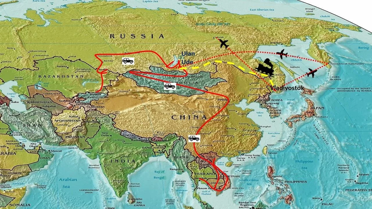 ENGLISH: At the beginning of June, we spent a few days in the city of Ulan Ude (east of Lake Baikal) and then traveled for three days on the Trans-Siberian Railway to Vladivostok (see the yellow line in the map below).