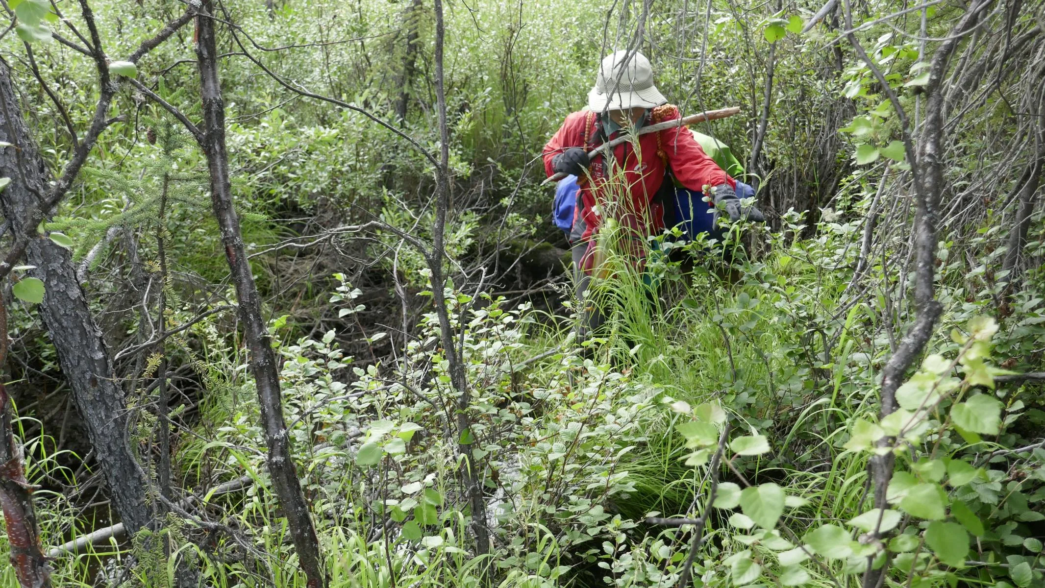 · Es gibt keine Wege: Wenn man gewohnt ist auf markierten Wanderwegen zu marschieren, dann ist der erste große Unterschied, dass es in der Wildnis von Kanada und Alaska keine ausgetretenen Wege gibt (abgesehen von den Wildtier-Pfaden der Bären, Elchen, Karibus und Wölfe, die meist zu Wasserstellen und Bächen führen). So wandert man entweder durch dichtes Unterholz oder entlang von Bächen und Flüssen. Das Gehen ist deutlich anstrengender und dauert viel länger. Mit schwerem Gepäck haben wir in Kanada im Muskeg (arktischer Moosboden) fallweise nur 500 m pro Stunde geschafft.