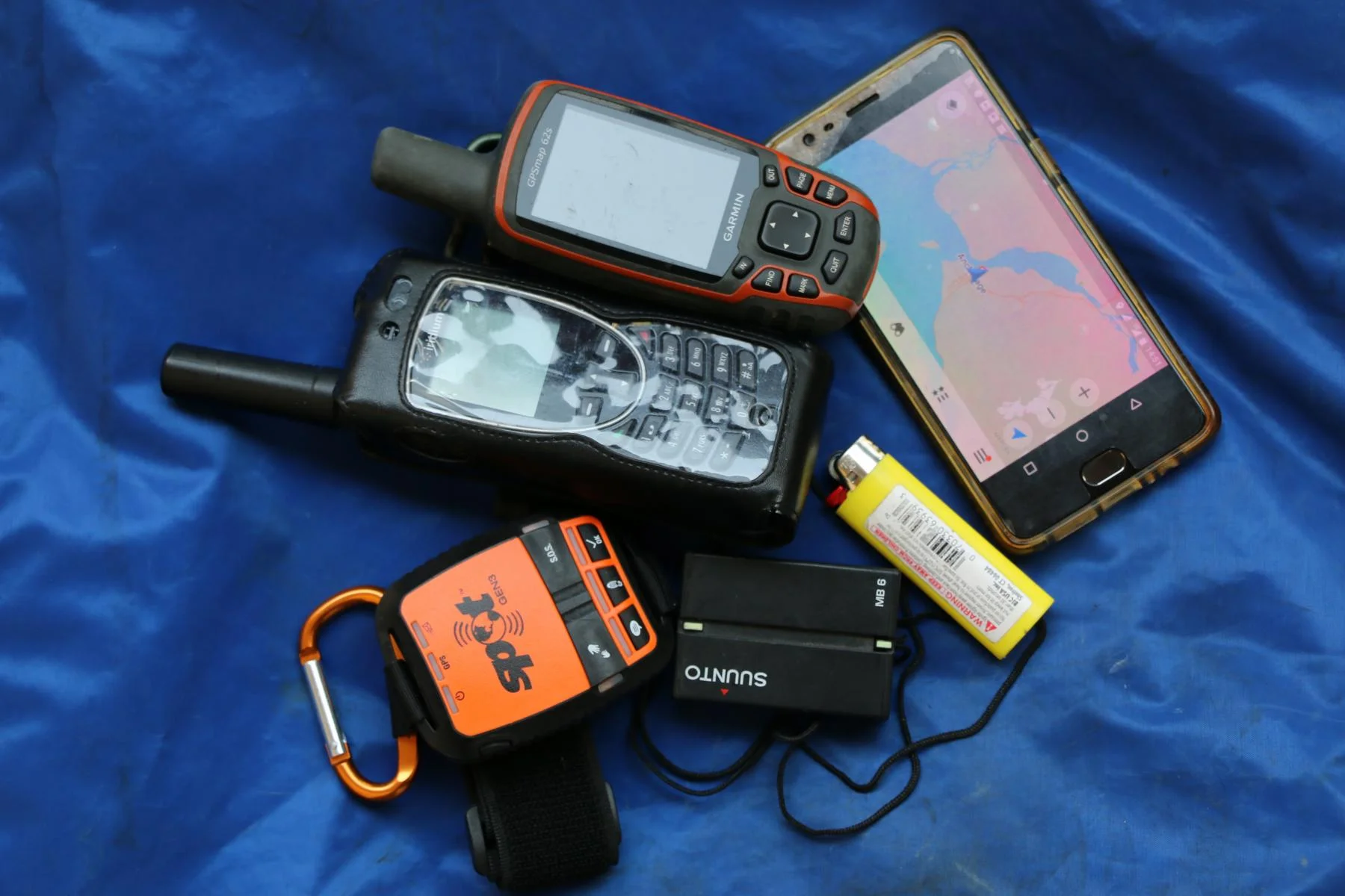 Einig nützliche Gegenstände zur Navigation und Kommunikation: Satelliten Telefon, SPOT 3, Kompass, GPS (Garmin und Handy).